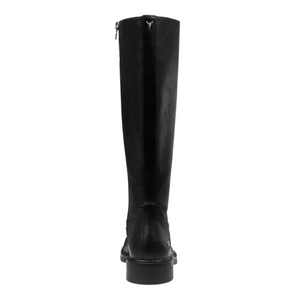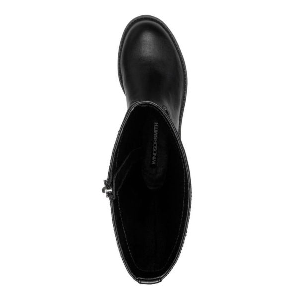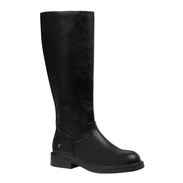 Black knee high boots with a non-leather upper and lining. Featuring a durable, non-slip T.P.R sole and a round toe shape, these boots include a full-length inside zipper with a bull logo puller.
