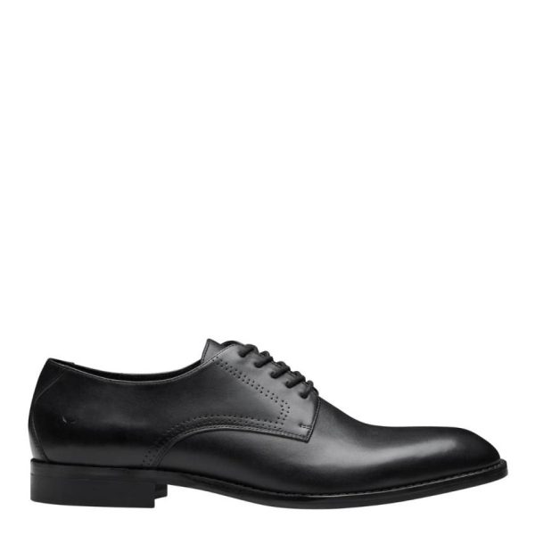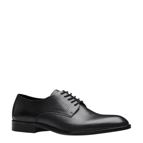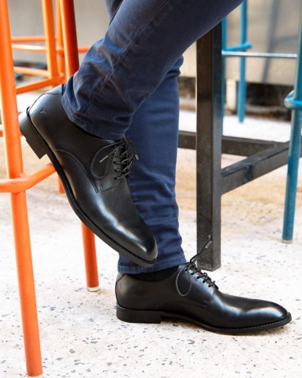 These black derby style shoes features a classic design with a plain upper and a five-eyelet facing for timeless appeal. The almond toe adds sophistication, making it suitable for various formal occasions.