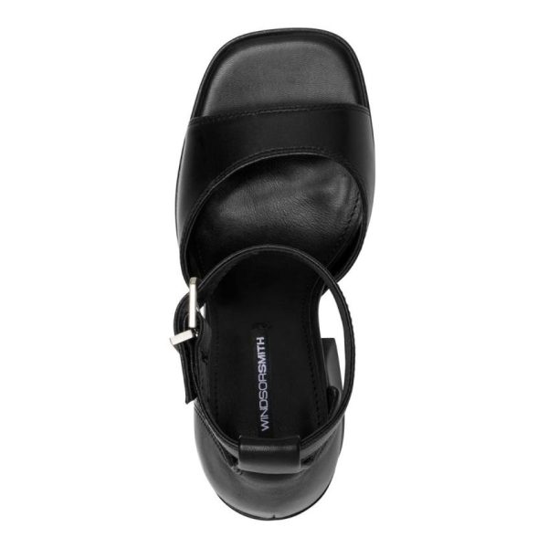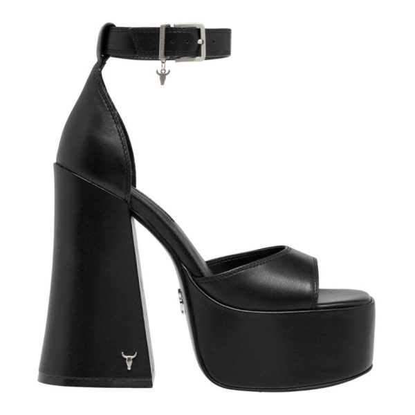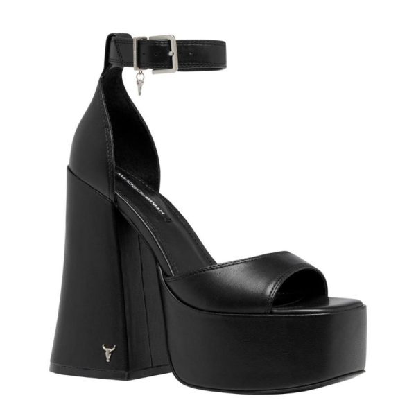 Black leather upper, these platform heels feature a soft square toe shape, buckle-up ankle strap, and high block heels standing at 14.2cm with a 5.5cm platform height.
