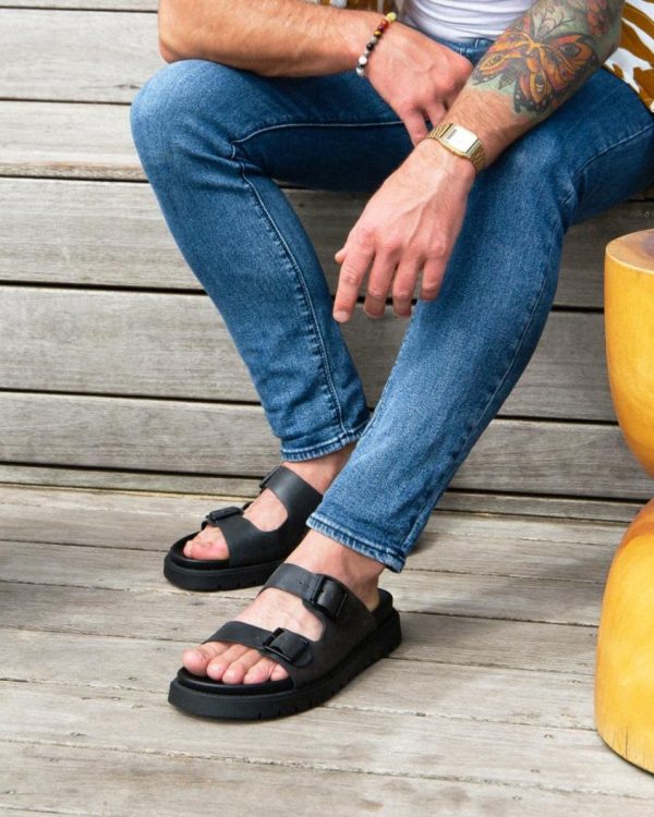Slip-on men’s sandals, feature a twin-strap design adorned with metal buckles, crafted from heavy-duty oil/wax distressed Pull-up leather. Soft molded P.U footbed that contours to your foot, while the durable T.P.R sole ensures lasting support and traction.